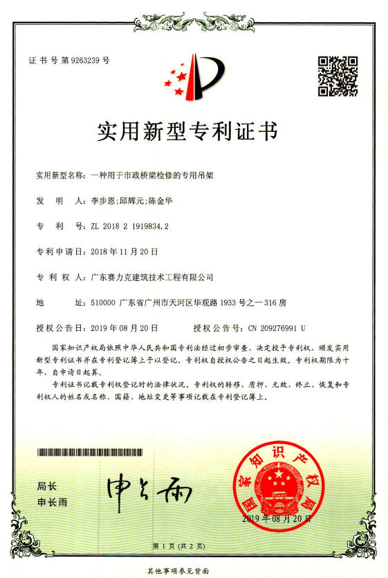 瀏覽量:1580 發(fā)布時(shí)間:2019.12.07由廣東賽力克建筑技術(shù)工程有限公司研發(fā)團(tuán)隊(duì)研發(fā)的“一種用于市政橋梁檢修的專用吊架”于2019年8月20日獲中華人民共和國(guó)國(guó)家知識(shí)產(chǎn)權(quán)局授予實(shí)用新型專利證書。專利號(hào):ZL 2018 2 1919834.2。
