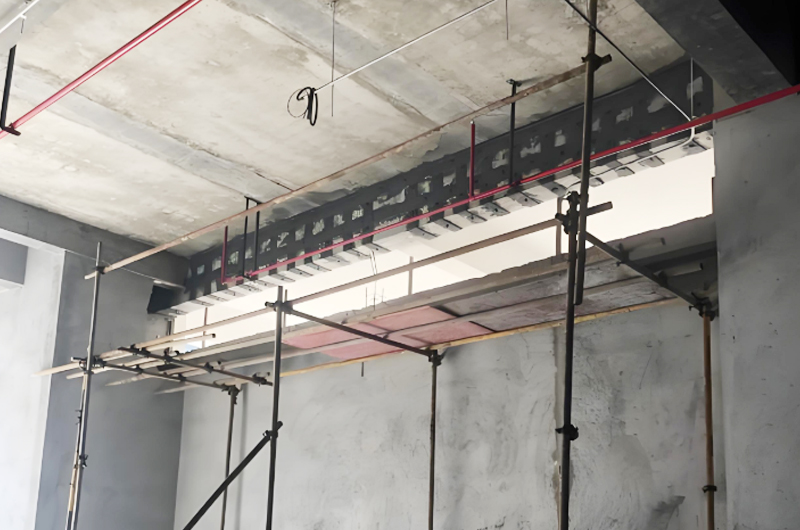 粘貼碳纖維布法:表面處理后涂刷底膠,粘貼碳纖維布并加壓固化,注意防護(hù)處理防止火災(zāi)。