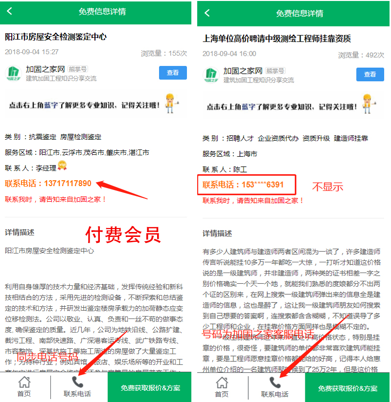 免費(fèi)會(huì)員一天只可以發(fā)布一條信息一個(gè)月最多可發(fā)布10條信息,聯(lián)系電話(huà)不能正常顯示,手機(jī)端最下面菜單欄電話(huà)只能放加固之家平臺(tái)的號(hào)碼;然而付費(fèi)會(huì)員發(fā)布信息擁有尊貴VIP標(biāo)識(shí),而且每條信息能夠正常顯示聯(lián)系電話(huà),而且一天發(fā)布信息條數(shù)沒(méi)有限制,還有手機(jī)端最下面菜單欄的聯(lián)系電話(huà)也能同步,大大方便用戶(hù)聯(lián)系。