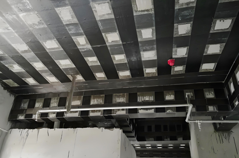 碳纖維加固對(duì)樓板抗壓承載力提升作用有限,若樓板因混凝土強(qiáng)度嚴(yán)重不足(如 C15 以下)或受壓區(qū)混凝土破損嚴(yán)重導(dǎo)致的承載力問(wèn)題,需結(jié)合增大截面、置換混凝土等技術(shù)聯(lián)合加固;此外,碳纖維材料耐高溫性能較差,在高溫環(huán)境(如廠(chǎng)房鍋爐房、冶煉車(chē)間)中需額外設(shè)置防火保護(hù)層(耐火極限需滿(mǎn)足設(shè)計(jì)要求)。